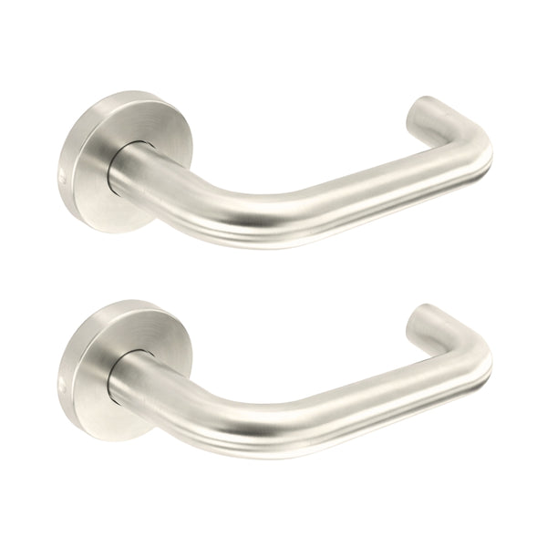 Our Securit branded, Safety Bar Style Latch Handles with a rose in a satin stainless steel finish are ideal for use in work environments with their simplistic but professional looks and great usability.